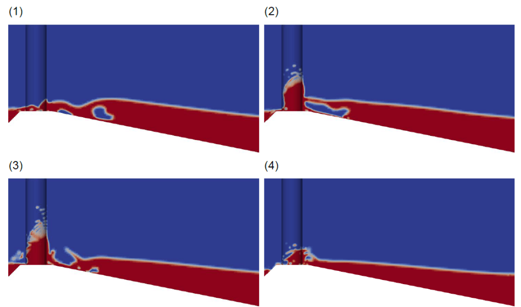 To capture the physics of every little water droplet that you can see in the above image, Jan’s model required incredibly high resoulution, and took weeks to run on high-powered computing clusters here in Delft and at Stanford University. His research is very valuable, because he was able to quantify precisely the rate at which the wave slams into a lighthouse and curls around it. This is important for being able to predict the force inflicted upon the structure.
