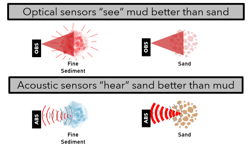 The next thing that we did was to see how big the sand particles floating through the water in Ameland were. This is important information for understanding where, how much, and what size of sand is moving around out there. Hopefully we can link the wave and tidal conditions with what we observe floating around in the water. However, this goal was made a lot more complicated by the fact that there is a lot of mud floating around in the waters of Ameland! The mud forms clumps about the same size as the sand grains, making them hard to tell apart using only one tool. We decided to try tools that use sound and light to measure the sand and mud. We can “hear” the sand better than mud and “see” the mud better than sand, which helps us tell them apart. I went to Ifremer in France to do some laboratory tests and try out our theory. When we applied it to our Ameland data it worked pretty well!