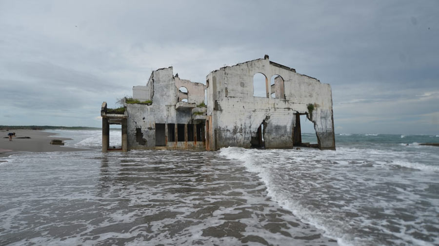It seems that the hotel was built on a type of coastal feature that is notorious for massive erosion world-wide: the beach adjacent to a tidal inlet. Tidal inlets connect lagoons with the ocean, the water rushing in and out of them several times a day. The water moves very fast and is stirred up by waves, so it can carry lots of sand and mud to and from the nearby coast. This means that this tidal inlets and the coastlines next to them have the potential to change shape dramatically over time. The inlet channel and smaller channels connected to it have a tendency to migrate back and forth across the underwater ebb-tidal delta like an out-of-control fire hose. If one of these channels is pushed up against the coast, it can cause massive erosion. This seems to be what happened to the abandoned hotel.