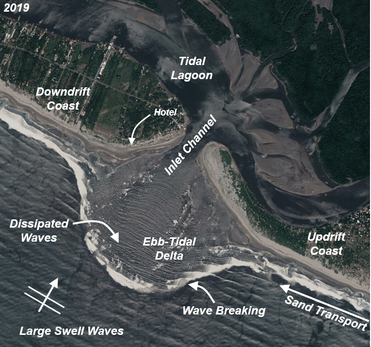 Tidal inlet at La Puntilla, El Salvador. The inlet channel connects the Pacific Ocean to a tidal lagoon, and is fronted by an underwater ebb-tidal delta. Large swell waves travel thousands of kilometers from the stormy south Pacific and break on the ebb-tidal delta (see the white foam), which greatly reduces their size. In this way, the ebb-tidal delta acts like a massive, sandy breakwater. Waves generate currents that push the sand from right to left along the coast, but the sand needs to cross the inlet. It makes this journey in regular spurts that lead to periodic accumulation and erosion of sand along the nearby coasts. This is the fate that befell our poor abandoned hotel.