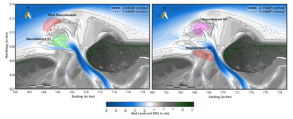 Different nourishment designs tested by Denzel. If you place the sand in a more dynamic area like a channel, it can have a much wider effect on the rest of the ebb-tidal delta.